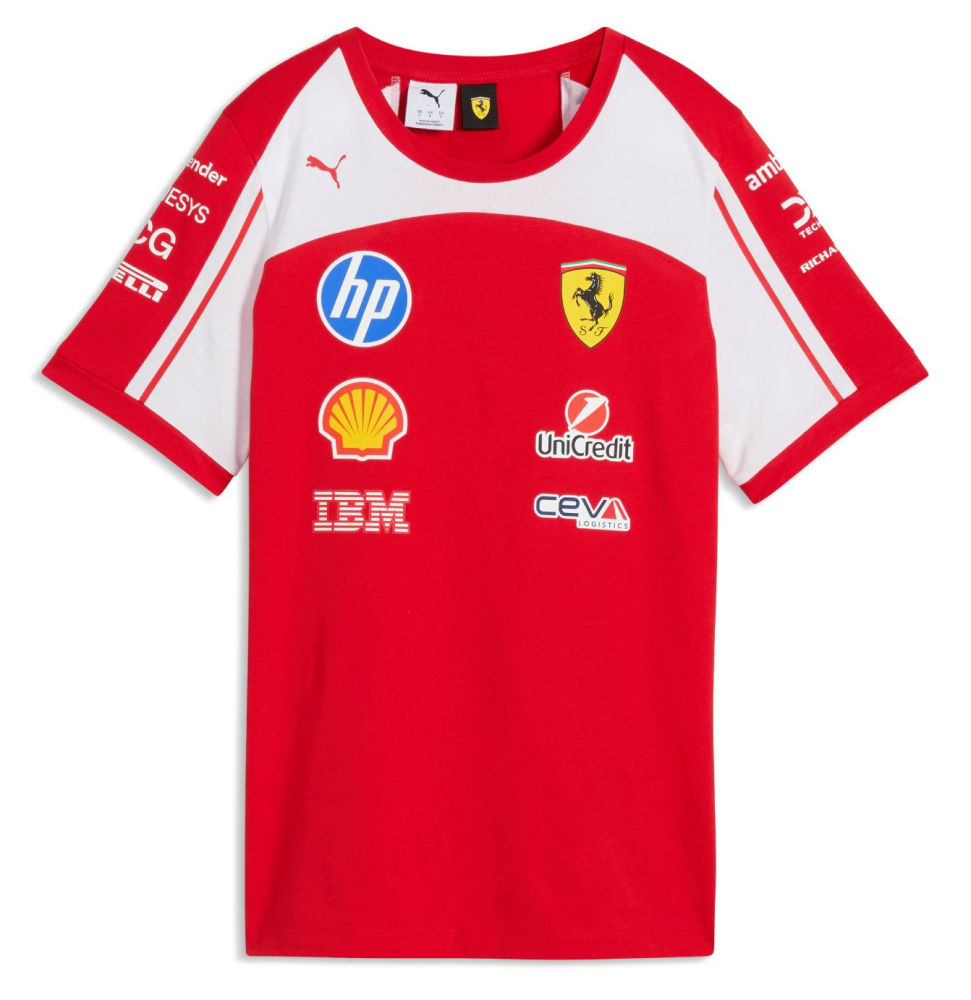Dámské týmové tričko Ferrari. V týmových barvách stáje Ferrari, se znakem Scuderia Ferrrari a logy sponzorů. Vyrobeno z vysoce kvalitní bavlny. Ferrari Ladies Team T-shirt.