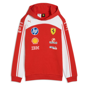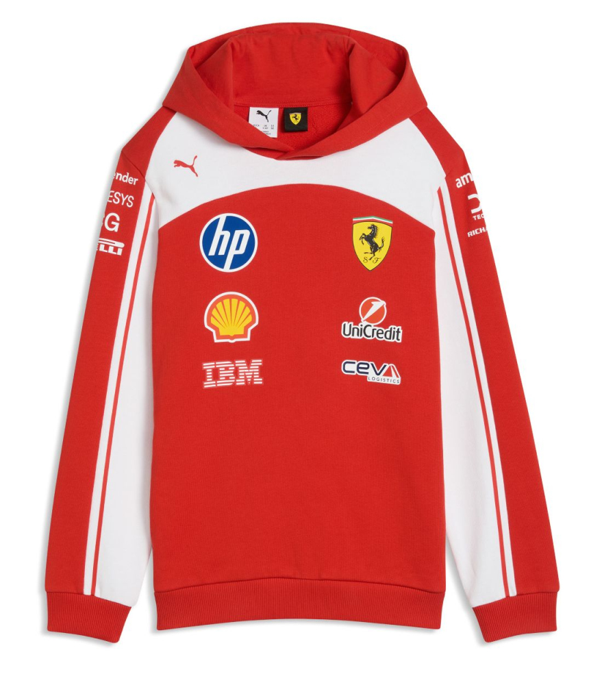 Dětská týmová mikina Scuderia Ferrari s kapucí. V týmových barvách stáje Ferrari, na přední straně logo Scuderia Ferrrari a loga sponzorů. Materiál : 100% bavlna. Ferrari F1 Kid’s Hoodie Team Sweatshirt.
