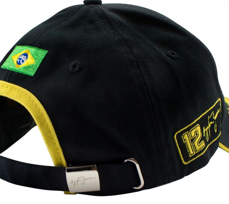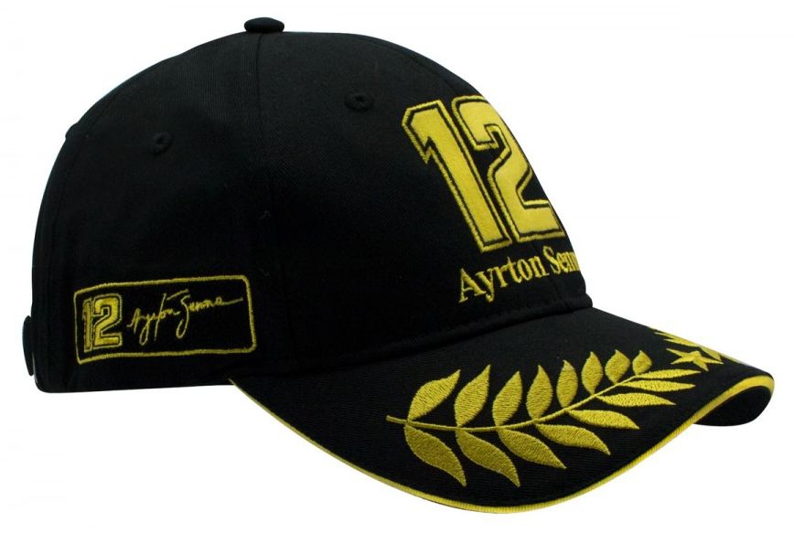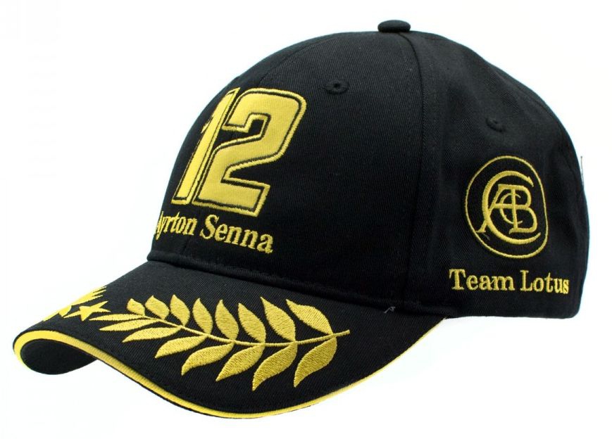 Kšiltovka Ayrton Senna "Team Lotus". Barva černá, na přední části se zlatě vyšitým startovním číslem jezdce, na boku s jeho podpisem. Na zadní části s vyšitou brazilskou vlajkou. Nastavitelná velikost. Materiál : 100% bavlna. Senna Team Lotus cap.