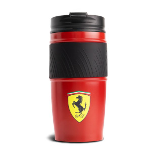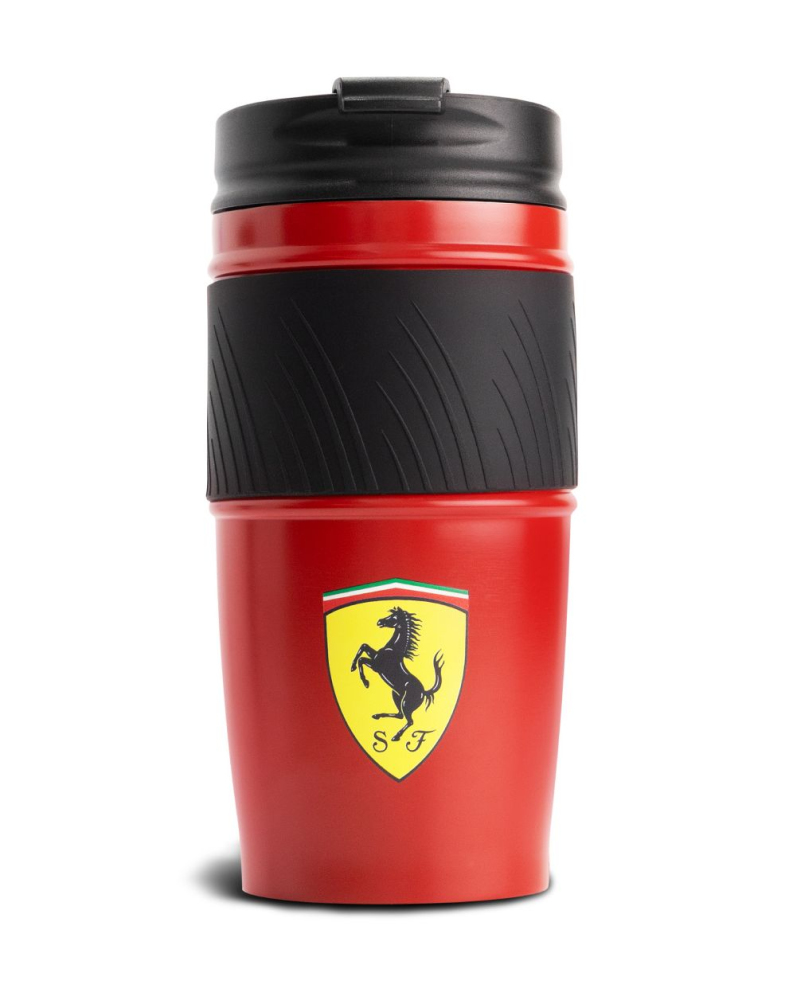 Termo hrnek Ferrari. Barva červená, s logem Scuderia Ferrari, objem 500 ml. Šroubovací víčko s uzávěrem zabraňujícím rozlití a silikonová rukojeť. Materiál : nerezová ocel a PVC. Ferrari F1 Thermal Mug Red.