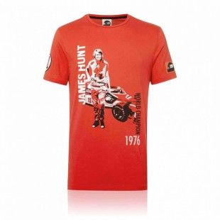 Pánské triko James Hunt s krátkým rukávem. Barva červená, s portrétem jezdce a jeho monopostu McLaren. Na pravém rukávu je startovní číslo jezdce, na levém jezdcova helma a vlajka Velké Británie. Materiál : 100% bavlna. James Hunt T-Shirt.