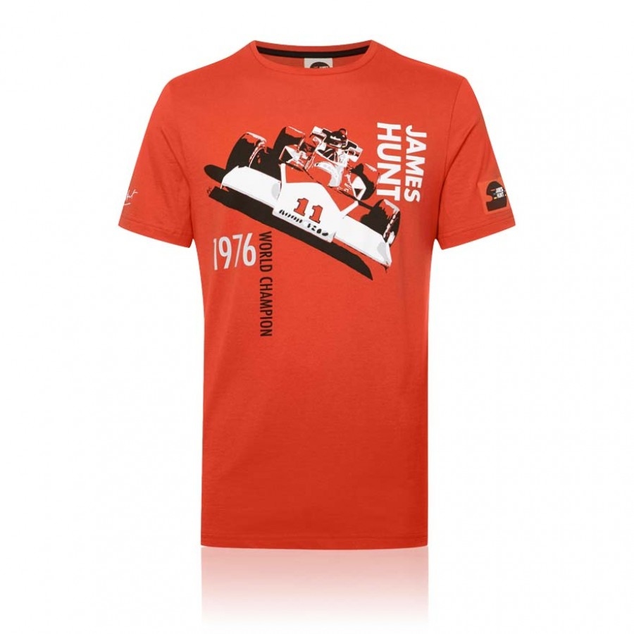 Pánské triko James Hunt "M23" s krátkým rukávem. Barva červená, s vyobrazením monopostu Jamese Hunta McLaren M23 z vítězné sezóny 1976. Na pravém rukávu je podpis jezdce, na levém jezdcova helma a vlajka Velké Británie. Materiál : 100% bavlna. James Hunt M23 T-Shirt.