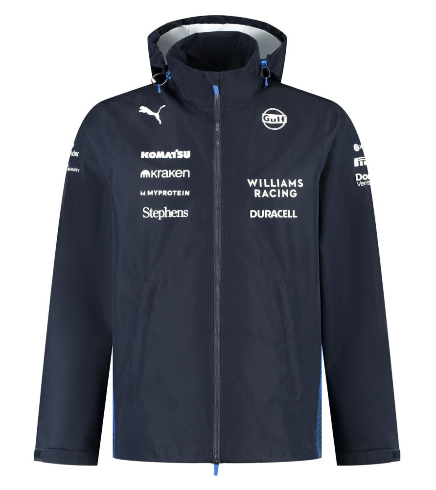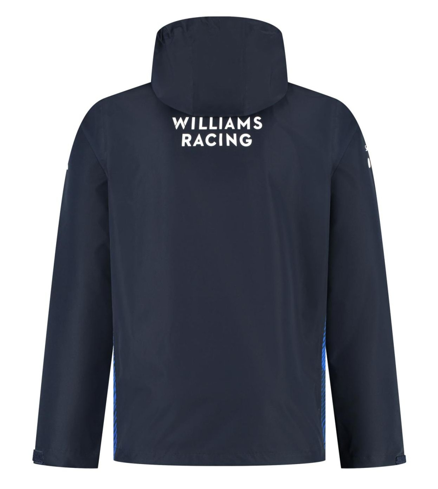 Týmová bunda Williams. V týmových barvách Williams Racing, v nepromokavém a větruvzdorném provedení. Skládací kapuce, dvě kapsy na bocích. Materiál : 100% polyester. Williams Racing Men’s Team Rain Jacket.