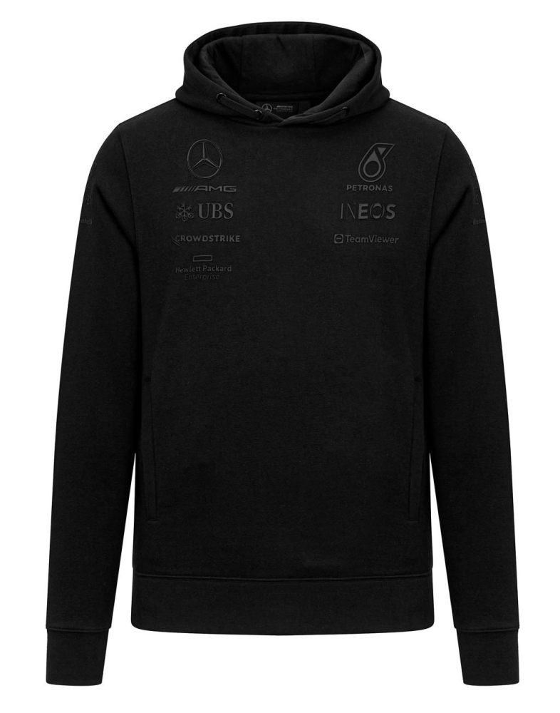 Pánská mikina s kapucí Mercedes AMG Stealth. Barva černá, s logem týmu Mercedes AMG Petronas a logy sponzorů. Materiál : kombinace bavlna a polyester. Mercedes AMG Team Stealth Hoodie Black.
