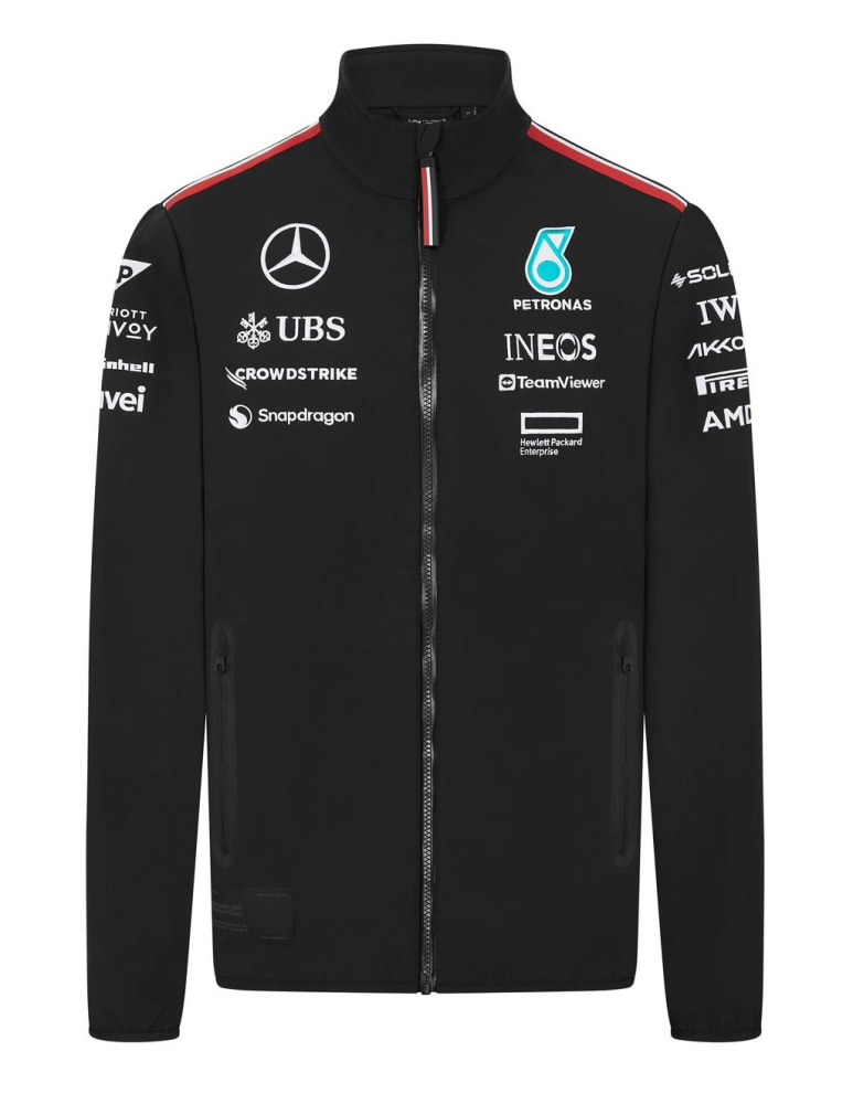 Týmová softshell bunda Mercedes AMG F1. V týmových barvách Mercedes AMG F1, v nepromokavém, větruvzdorném a zároveň prodyšném provedení. Materiál : polyester. MAMGP F1 Mens Softshell Jacket Black.