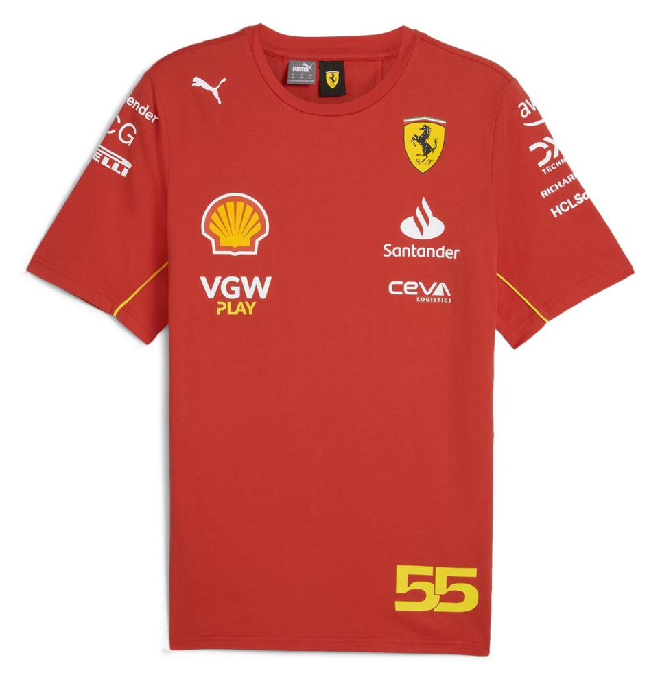 Týmové tričko Ferrari - Carlos Sainz Replica. V týmových barvách stáje Ferrari, na přední straně logo Scuderia Ferrrari a loga sponzorů. Materiál : 100% bavlna. Sainz Team Ferrari F1 Men’s T-shirt.